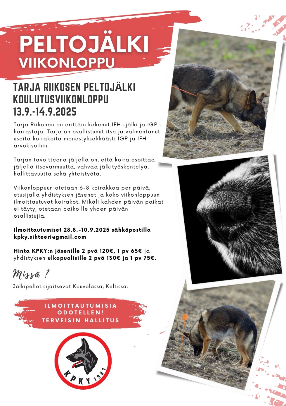 - 23.8.2025 Kouvolan kaikkien rotujen näyttelyt. Olemme tänäkin vuonna järjestämässä Kouvolan koiranäyttelyitä. Merkatkaahan ylös, talkoilijoita tullaan tarvitsemaan 😊